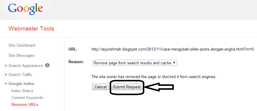 To the point saja, cara menghapus duplikat konten atau duplikat URL di mesin pencari Google bisa dilakukan di dalam akun Google Webmaster Tools. Adapun caranya adalah sebagai berikut :
