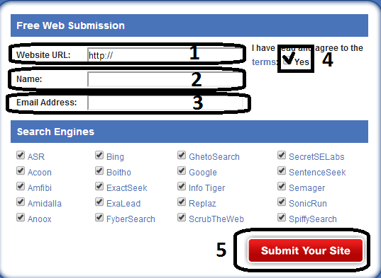 2. Masukkan URL web atau blog, nama dan email kita, centang kolom trem “Yes” lalu kilk “Submit Your Site” seperti gambar di bawah ini :